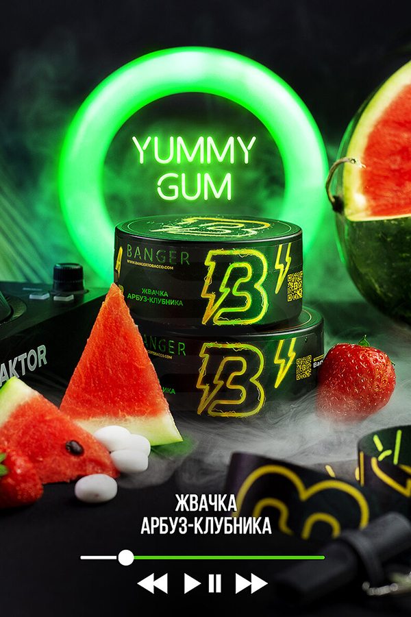 Banger Yummy gum (Жвачка арбуз-клубника) – топовый вкус сладкой жвачки, который не покинет вас до самого конца покура. Сладкая, спелая клубника отлично сочетается с не менее сладким и ароматным арбузом. К этому миксу вам захочется возвращаться снова и снова! Вкус представлен как готовый микс, но и никто не запрещает его использовать в сочетании с другими табаками. Наоборот, рекомендуется!