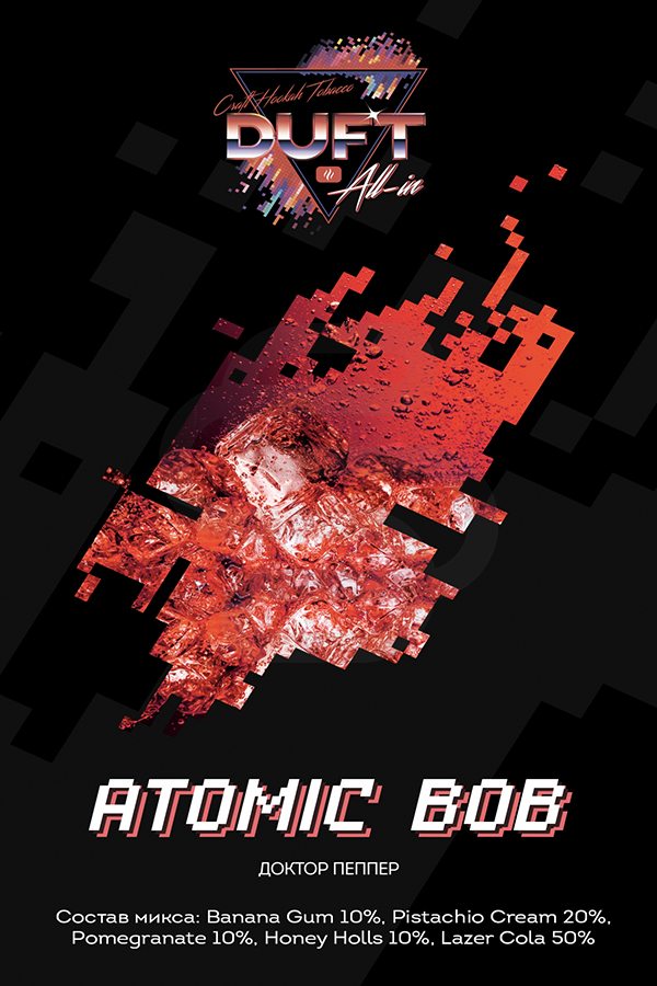 Duft All In Atomic Bob (Прохладительные напитки) – освежающий вкус сладкого Доктора Пеппера с насыщенным ягодным послевкусием. Отличная аромка для любителей сладких, но в то же время и освежающих вкусов. Табак круто курится как соло, так и в миксах. Советуем добавить немного фруктов и мяты.