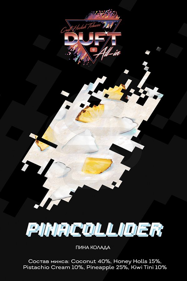Duft All In Pinacollider (Карибский коктейль) – топовый вкус популярного коктейля, который с первого же вдоха попадет в ваши любимчики! Насыщенные сливочные нотки постепенно переходят в освежающую кислинку ананаса заполня собой все вокруг. Шикарный аромат и крутейший вкус покорят любого кальянщика!