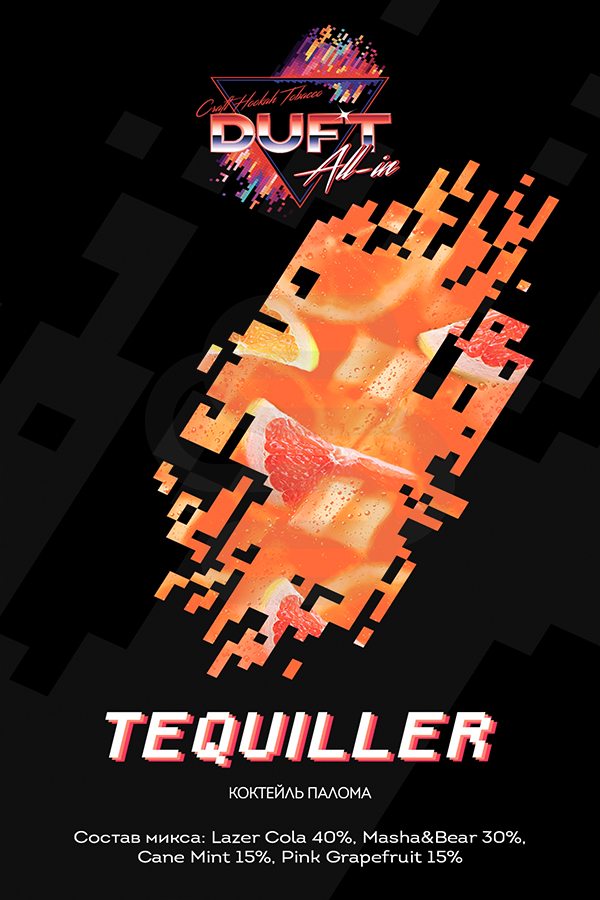 Duft All In Tequiller (Алкогольный коктейль) – пьянящий вкус коктейля Палома. Здесь вы найдете текилу, слегка горьковатый сок грейпфрута, освежающую мяту, землянику и даже капельку колы. Сбалансированный вкус, который можно смело забивать соло и наслаждать крутым отдыхом с дымным кальянчиком.