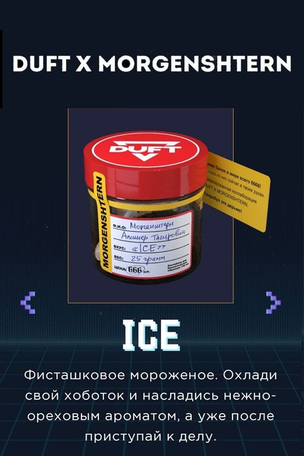 Duft x Morgenshtern ICE (Фисташковое мороженное) – нежный ореховый аромат настоящего фисташкового мороженого. Очаровательная сливочная сладость смешена с легкими нотками соленого орешка. Вкус достаточно насыщен, но не приторный и приятный в послевкусии. Отлично подходит как для забивки соло, так и в миксах.