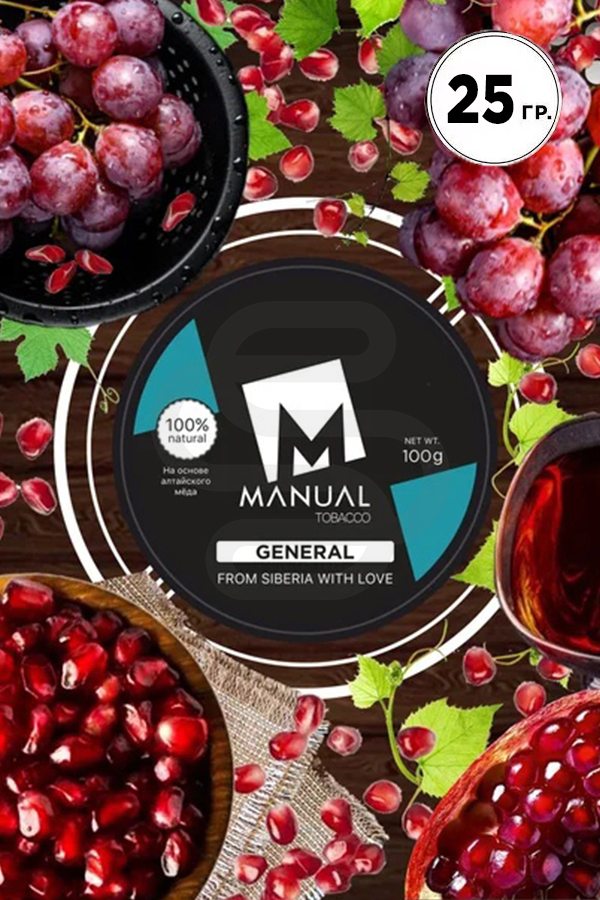 Manual Blue — GENERAL (Гранат-виноград) — необычный вкус сочного микса красного винограда и граната. Яркие кисленькие нотки перерастают в манящую сладость с легкими терпкими нотками спелого граната. Головокружительный аромат покорит вас с первых же минут!