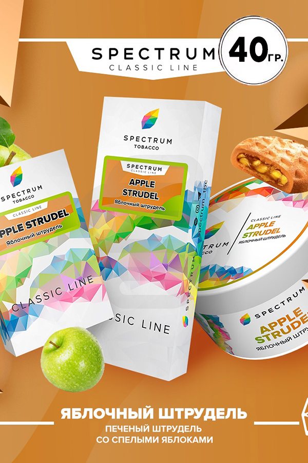 Spectrum Apple strudel (Яблочный штрудель) — топовый вкус свежеиспеченной по лучших австрийским рецептам выпечки. Нежное слоенное тесто идеально сочетается с кисленькими зелеными яблоками. Эти два ингредиента дополняют друг друга как инь и янь. Для разнообразия к ним можно добивать кисленьких ягод или цитрусов.