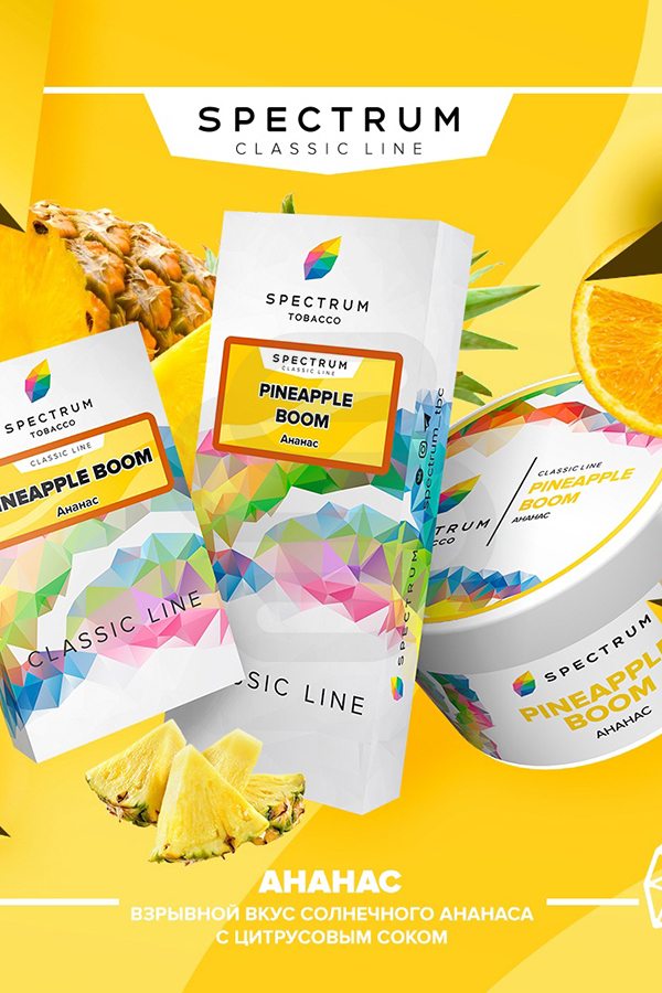 Spectrum Pineapple Boom (Ананас) — спелый, сочный и почти уже твой. Скорее доставай чашу и разогревай угли, ведь тебе предстоит насладиться самым натуральным и кислым ананасом. Его однозначно стоит попробовать соло, чтобы прочувствовать всю многогранность и насыщенность аромки.