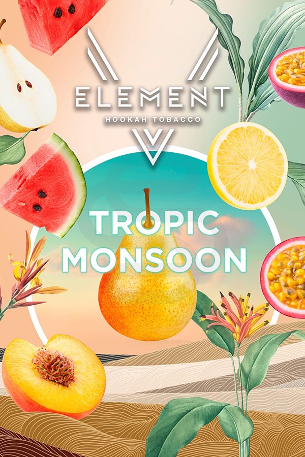 V Element Tropic Monsoon (Арбуз, персик, маракуйя, лимон) – сочный кисло-сладкий микс сочного арбуза, персика, тропической маракуйи и лимона.